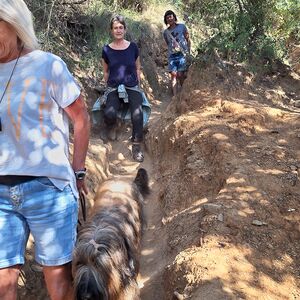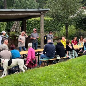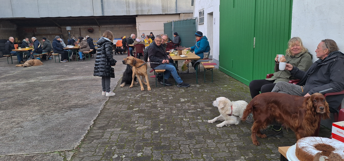 Weiter ging es zum Forsthaus Heldenstein. Nach einer kurzen Kaffeepause mussten die Mensch-Hund-Teams dann nochmal ran: Crosswalk im Pfälzerwald mit Stelzenlaufen, Würstchenparcours und Gruppenbild (ein paar Teilnehmer*innen haben am Forsthaus pausiert). Im Anschluss dann ein fast sonniger Abschluss bei uns im Hof mit Grillwurst, Feuertopf, Nusszopf ... und einem köstlichen Schokokuchen der Patisserie Rebert, Wissembourg, gespendet von Nicole und Karma.